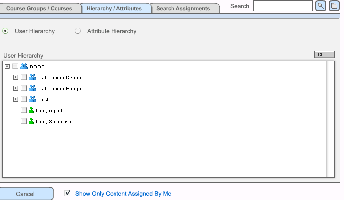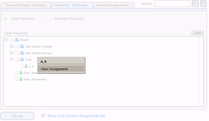 In figure 2 in "User Hierarchy" tree view I have checked "n,k" which is part of "Test" group, and in figure 1 I have selected "Test1" from "Course Groups" tree view and there are two courses in "Selected Courses" grid.