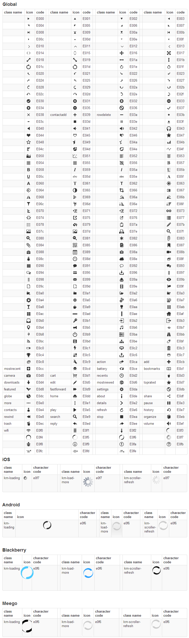 I'm having a really hard time trying to figure out what icons are available in Kendo UI Mobile. I was able to get a list of class names by looking through the unminified stylesheet, but I noticed a lot of hex values were missing.
