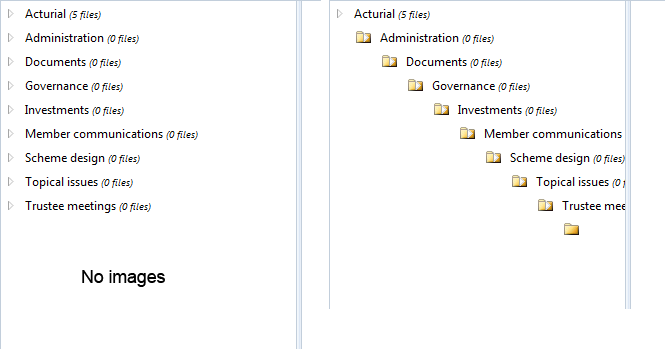 private void GetTree(){ PDUser U = PDUser.GetCurrentUser(); List<Folder> FolderList = Folder.GetFolders(U.SchemeID, 0, 0); foreach (Folder F in FolderList) { //Create parent RadTreeNode NewNode = new RadTreeNode(); NewNode.ImageUrl = imageURL; NewNode.Text = F.FolderName + "<span style='font-style:italic; font-size:10px;'> (" + F.DocumentCount.ToString() + " files)</span>"; NewNode.ToolTip = F.FolderName; NewNode.Value = F.FolderID.ToString(); //Create children GetChild(U.SchemeID, U.UserID, F.FolderID, ref NewNode); rdTreeView.Nodes.Add(NewNode); }}private void GetChild(int SchemeID, int UserID, int FolderID, ref RadTreeNode NewNode){ List<Folder> FolderList = Folder.GetFolders(SchemeID, 0, FolderID); foreach (Folder F in FolderList) { RadTreeNode ChildNode = new RadTreeNode(F.FolderName); GetChild(SchemeID, UserID, F.FolderID, ref ChildNode); ChildNode.ImageUrl = imageURL; ChildNode.Text = F.FolderName + "<span style='font-style:italic; font-size:10px;'> (" + F.DocumentCount.ToString() + " files)</span>"; ChildNode.ToolTip = F.FolderName; ChildNode.Value = F.FolderID.ToString(); NewNode.Nodes.Add(ChildNode); }}//Populate GridView with available documentsprotected void rdTreeView_NodeClick(object sender, RadTreeNodeEventArgs e){ PDUser U = PDUser.GetCurrentUser(); string folderStr = e.Node.Value; int folderID = Convert.ToInt32(folderStr); List<Document> DocumentList = Document.GetDocuments(U.UserID, folderID); rdViewDocuments.DataSource = DocumentList; rdViewDocuments.DataBind(); rdViewDocuments.Visible = true;}