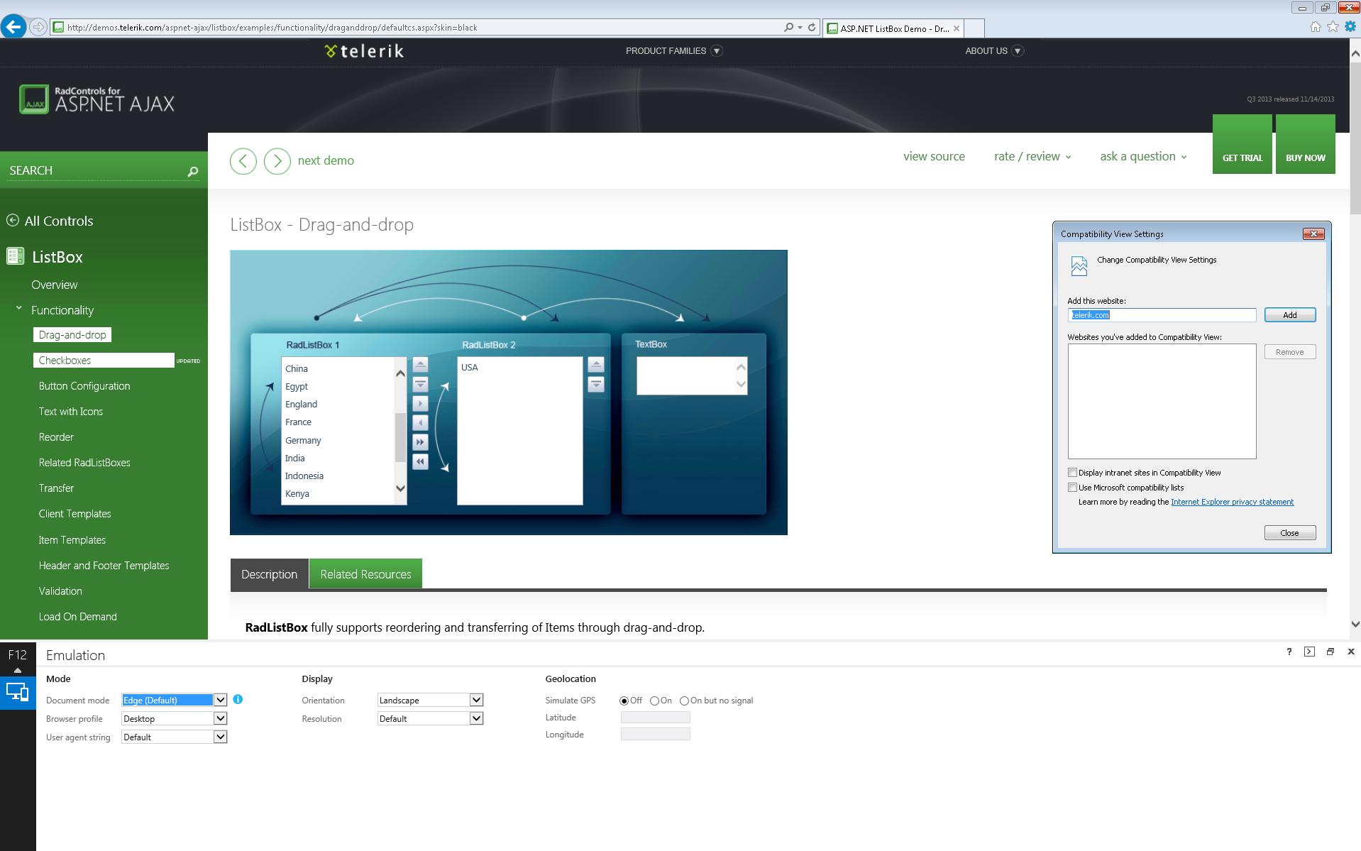 I'm using Windows 8.1/IE 11 and the latest Telerik release, Q3 '13, dated 10/14/13 and am seeing a variety of rendering issues w/ the RadListbox control. For example, take a look at the demo page using IE 11: