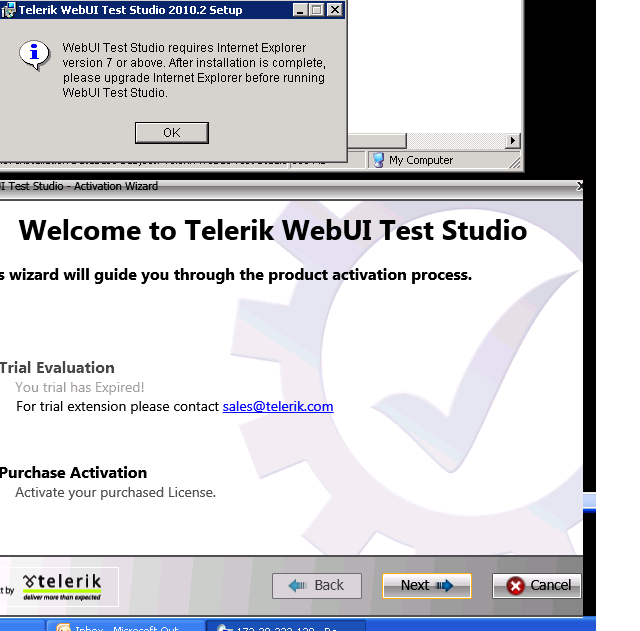 Seems the trail period has expired for the build "Support-Telerik.WebUI.TestStudio.QA.2010.2.830.msi", please increase the trail period, as post installation it displays Success message but next page it displays "Trail version has expired"