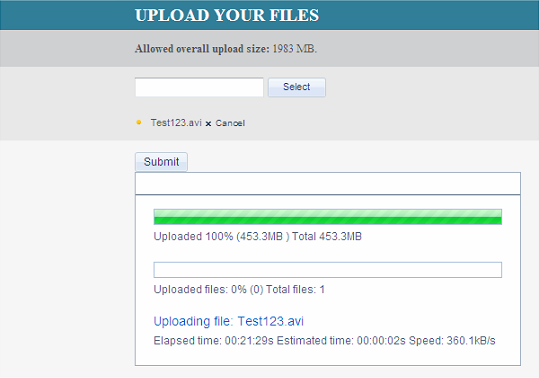 My understanding if upload finish progress bar will close and green icon near file name will show.