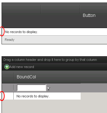 There appears to be a display issue in IE6 (on PC) when a RadGrid has no records. I am using the latest version of the Telerik Controls. I have a regular old RadGrid in my aspx page and inside the radgrid is the mastertableview with a nomasterrecordstext of "(There are no terms)". When the grid has no records from the db, it shows the text "(There are no terms)", but to the left of the text is a vertical black line about 1/2" in height. I'm assuming it's an IE6 CSS issue since it doesn't happen in any other browser. IE7 is fine. My customer uses IE6 and has complained about that vertical line being there. Any ideas? (other than telling my customer to upgrade their browser)