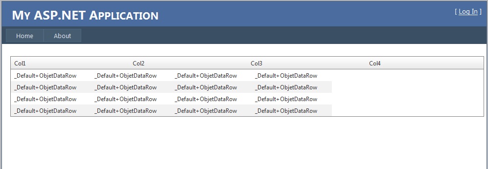 <%@ Page Title="Home Page" Language="C#" MasterPageFile="~/Site.master" AutoEventWireup="true" CodeFile="Default.aspx.cs" Inherits="_Default" %><%@ Register Assembly="Telerik.Web.UI" Namespace="Telerik.Web.UI" TagPrefix="telerik" %><asp:Content ID="HeaderContent" runat="server" ContentPlaceHolderID="HeadContent"></asp:Content><asp:Content ID="BodyContent" runat="server" ContentPlaceHolderID="MainContent" > <asp:Panel runat="server" Width="968px"> <div style="height: 20px"></div> <div> <telerik:RadGrid ID="RadGrid1" runat="server" AllowSorting="True" AutoGenerateColumns="False" CellSpacing="0" GridLines="None"> <ClientSettings > <Resizing AllowColumnResize="True" ResizeGridOnColumnResize="False" ></Resizing> <Scrolling AllowScroll="True" UseStaticHeaders="True" SaveScrollPosition="True" ></Scrolling> </ClientSettings> <MasterTableView > <Columns> <telerik:GridBoundColumn FilterControlAltText="Filter column column" EmptyDataText="" HeaderText="Col1" UniqueName="column1"> <HeaderStyle Width="150px" /> </telerik:GridBoundColumn> <telerik:GridBoundColumn FilterControlAltText="Filter column1 column" HeaderText="Col2" UniqueName="column2"> <HeaderStyle Width="150px" /> </telerik:GridBoundColumn> <telerik:GridBoundColumn FilterControlAltText="Filter column2 column" HeaderText="Col3" UniqueName="column3"> <HeaderStyle Width="150px" /> </telerik:GridBoundColumn> <telerik:GridBoundColumn FilterControlAltText="Filter column3 column" HeaderText="Col4" UniqueName="column4" EmptyDataText=""> <HeaderStyle Width="150px" /> </telerik:GridBoundColumn> </Columns> </MasterTableView> </telerik:RadGrid> </div> <div style="height: 20px"></div> </asp:Panel></asp:Content>cs