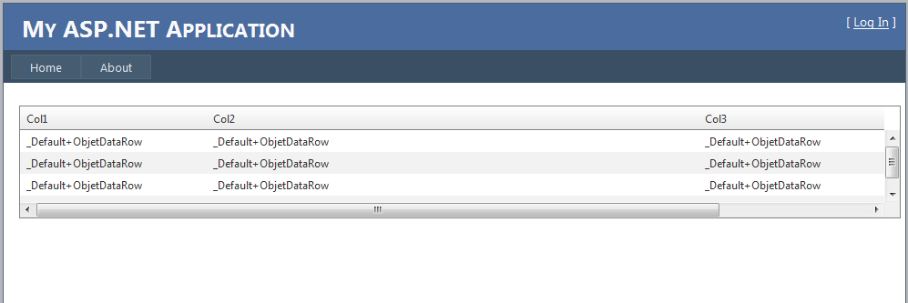 using System;using System.Collections.Generic;using System.Linq;using System.Web;using System.Web.UI;using System.Web.UI.WebControls;public partial class _Default : System.Web.UI.Page{ public class ObjetDataRow { public string Colonne1 { get; set; } public string Colonne2 { get; set; } public string Colonne3 { get; set; } public string Colonne4 { get; set; } } private IList<ObjetDataRow> datas { get; set; } protected void LoadData() { if (datas == null) { datas = new List<ObjetDataRow> { new ObjetDataRow() { Colonne1 = "Row1Colonne1", Colonne2 = "Row1Colonne2", Colonne3 = "Row1Colonne3", Colonne4 = "Row1Colonne4" }, new ObjetDataRow() { Colonne1 = "Row2Colonne1", Colonne2 = "Row2Colonne2", Colonne3 = "Row2Colonne3", Colonne4 = "Row2Colonne4" }, new ObjetDataRow() { Colonne1 = "Row3Colonne1", Colonne2 = "Row3Colonne2", Colonne3 = "Row3Colonne3", Colonne4 = "Row3Colonne4" }, new ObjetDataRow() { Colonne1 = "Row4Colonne1", Colonne2 = "Row4Colonne2", Colonne3 = "Row4Colonne3", Colonne4 = "Row4Colonne4" } }; } RadGrid1.ClientSettings.Scrolling.ScrollHeight = new Unit(); } protected void Page_Load(object sender, EventArgs e) { LoadData(); if (!IsPostBack) { RadGrid1.DataSource = datas; } }}cordially