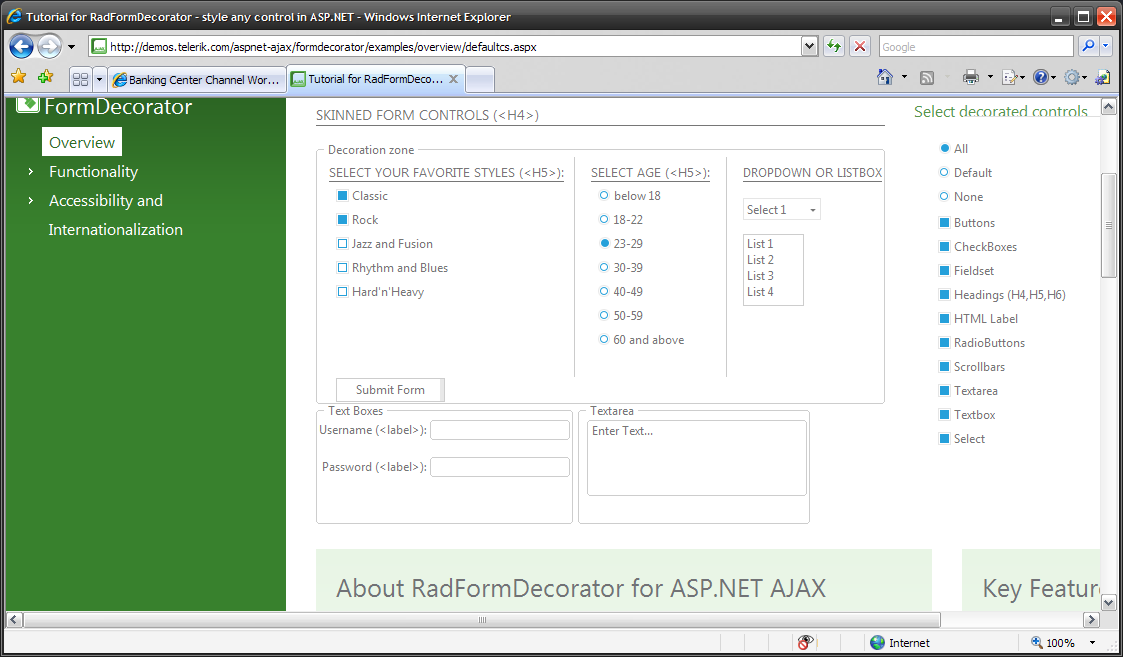 "I browsed all the RadFormDecorator demos using IE7 and there is no a single messed up page."