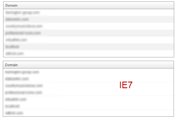 I am using the RadGrid default skin and when rendering in IE7, I am not getting the alternating row styles or the hover row style. Please see the attached image.