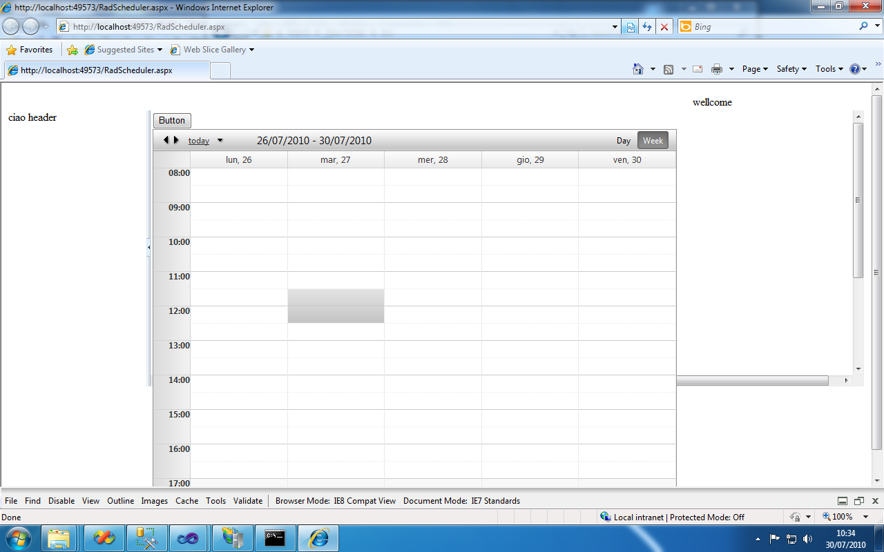 <%@ Page Language="C#" AutoEventWireup="true" CodeBehind="RadScheduler.aspx.cs" Inherits="Default" %><%@ Register Assembly="Telerik.Web.UI, Version=2010.2.713.40, Culture=neutral, PublicKeyToken=121fae78165ba3d4" Namespace="Telerik.Web.UI" TagPrefix="telerik" %><!DOCTYPE html PUBLIC "-//W3C//DTD XHTML 1.0 Transitional//EN" "http://www.w3.org/TR/xhtml1/DTD/xhtml1-transitional.dtd"><html xmlns="http://www.w3.org/1999/xhtml"><head runat="server"> <title></title> </head><body> <form id="form1" runat="server"> <telerik:RadScriptManager ID="RadScriptManager1" runat="server"> <Scripts> <asp:ScriptReference Assembly="Telerik.Web.UI" Name="Telerik.Web.UI.Common.Core.js" /> <asp:ScriptReference Assembly="Telerik.Web.UI" Name="Telerik.Web.UI.Common.jQuery.js" /> <asp:ScriptReference Assembly="Telerik.Web.UI" Name="Telerik.Web.UI.Common.jQueryInclude.js" /> </Scripts> </telerik:RadScriptManager> <asp:Panel runat="server" ID="pnl" CssClass="page"> <table cellpadding="0" cellspacing="0" width="100%" border="0" height="100%" class="pageContent"> <!-- Header --> <tr> <td class="header_final"> <table width="100%"> <tr> <td width="80%"> </td> <td class="header_loggeduser"> wellcome </td> </tr> </table> </td> </tr> <tr> <td width="100%" height="100%"> <telerik:RadSplitter Skin="WebBlue" BorderSize="0" ID="RadSplitter2" runat="server" Height="100%" Width="100%"> <telerik:RadPane ID="LeftPane" runat="server" Width="200" Scrolling="None"> ciao header </telerik:RadPane> <telerik:RadSplitBar ID="RadSplitbar2" EnableResize="false" runat="server" CollapseMode="Forward"> </telerik:RadSplitBar> <telerik:RadPane ID="MiddlePane" runat="server"> <!-- Content --> <!--<td valign="Top">--> <table width="100%"> <tr> <td> <asp:UpdatePanel runat="server" ID="MasterUpdatePanel"> <ContentTemplate> <asp:Button ID="Button1" runat="server" Text="Button" /> <div> <telerik:RadScheduler ID="SchedulerAttivita" runat="server" style="z-index:0;" EnableCustomAttributeEditing="True" Width="759px" AllowDelete="False" AllowInsert="False" WeekView-HeaderDateFormat="dd/MM/yyyy" MonthView-UserSelectable="false" TimelineView-UserSelectable="false" DayView-UserSelectable="true" OverflowBehavior="Expand" ShowFooter="False" ShowAllDayRow="False" AppointmentStyleMode="Default" FirstDayOfWeek="Monday" AdvancedForm-Enabled="false" LastDayOfWeek="Friday" DataKeyField="ID" DataStartField="DATA_INIZIO" DataEndField = "DATA_FINE" DataSubjectField="SUBJECT" SelectedView="WeekView" Culture="it-IT" EnableAdvancedForm="False" HoursPanelTimeFormat="t"> <AdvancedForm Enabled="False" EnableCustomAttributeEditing="True"></AdvancedForm> <Localization /> <TimelineView UserSelectable="False"></TimelineView> <WeekView HeaderDateFormat="dd/MM/yyyy"></WeekView> <MonthView UserSelectable="False"></MonthView> </telerik:RadScheduler> </div> </ContentTemplate> </asp:UpdatePanel> </td> </tr> </table> <!--</td>--> </telerik:RadPane> </telerik:RadSplitter> </td> </tr> </table> </asp:Panel> </form></body></html>I also attach a screenshot of what I'm seeing in my browser.