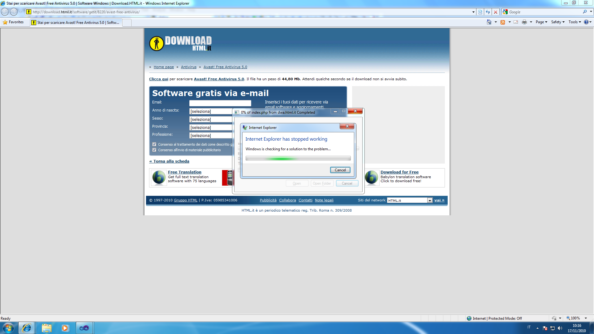 thank you for your solution, I tried to execute whitout change anything and it works but when I tried to execute in my case it not works but it crash IE8 like in image1 and image2. The problem is that in my case the dialogs that IE open when I tried to dowload the file are two and not only one like in your case. To reproduce my case you can execute this code infact the image1 and image2 are the snapshot made when this code is running.