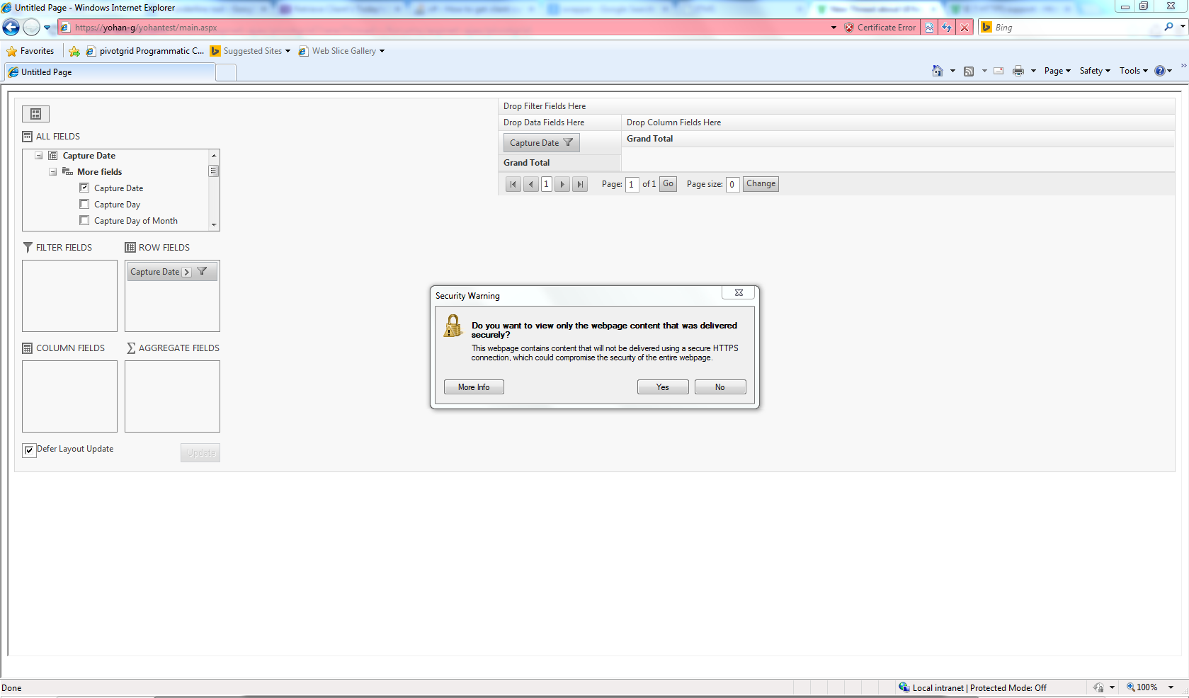I'm using OLAP Pivot Grid with HTTPS protocol and it gives a warning saying "This page contains both secure and nonsecure items" on IE8 for some specific scenarios. I have loaded the pivot grid in an iframe and wrapped with a RadAjaxPanel. I have attached a sample project and screenshot of the mentioned security warning (rename the extension of test_project.jpg as test_project.rar).