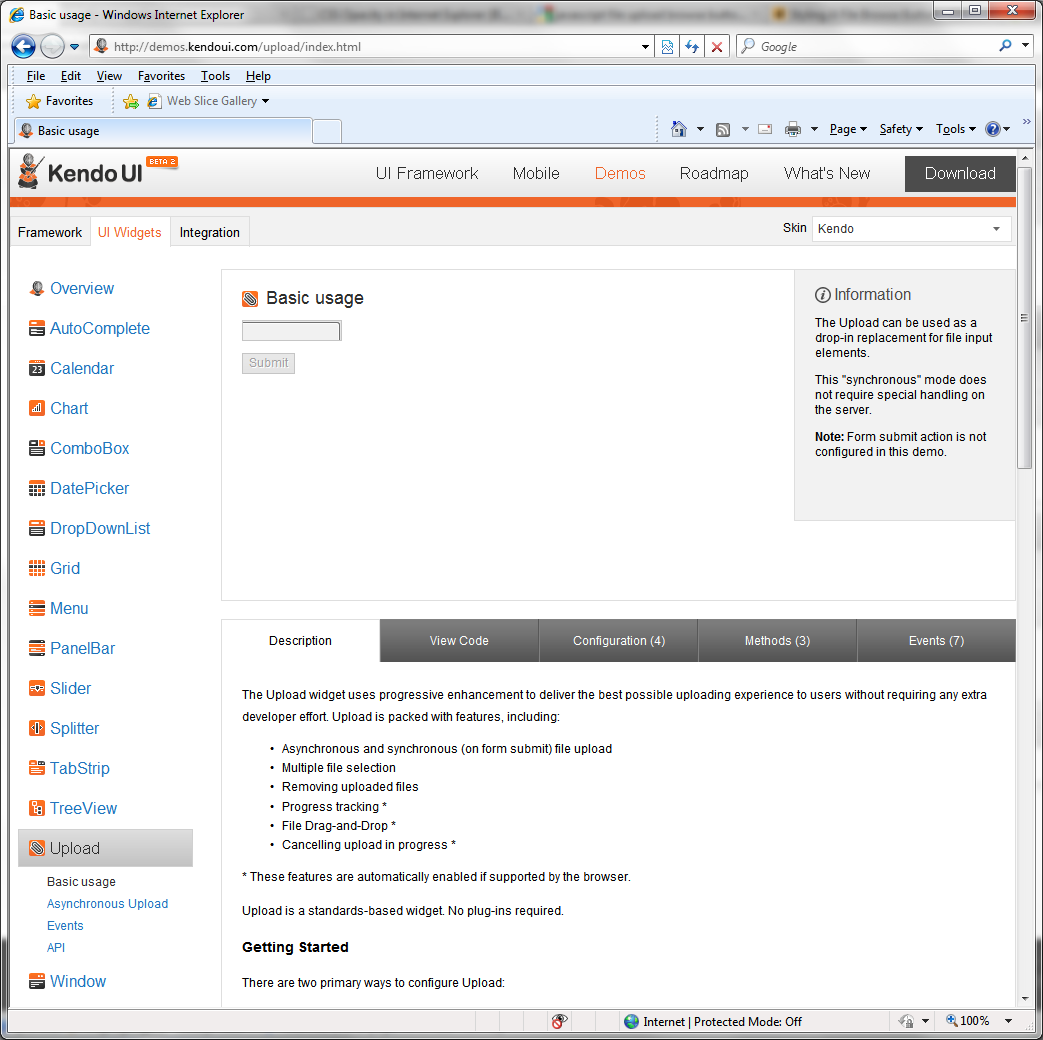 Yet none of all this works. Since the Telerik example does work, it must be one of those obscure, unexplicable IE-specific bugs. I will retest this later for the next release. Maybe you can check the basic upload example from your website in IE8 for your latest development version, to see if there are any issues?