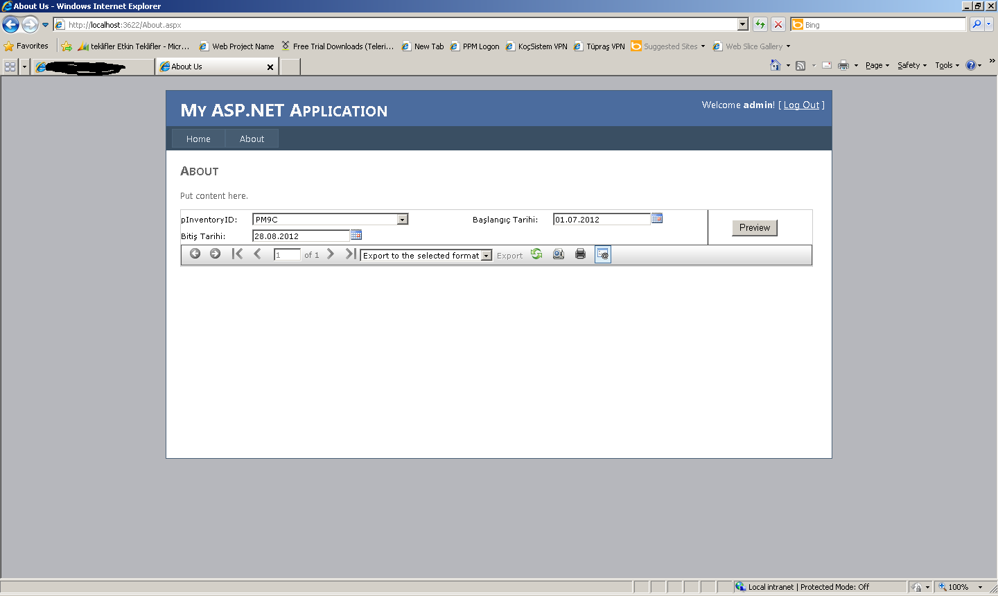 Bun in IE8 after selecting the proper report parameters i press the preview button on the report. The "Generating the report" indicator appears. But nothing is rendered on the screen. What i see is just the reportviewers toolbar and parameters section. The reports content looks to be not rendered with IE8.
