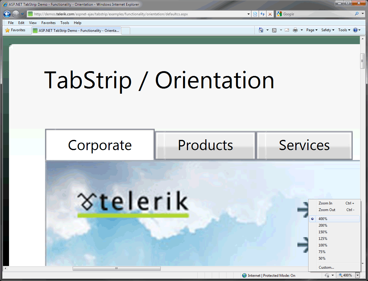When using the Zoom feature of IE8 (I haven't tested any other browsers or versions) the graphics in the skin of the RadTabstrip do not display properly.