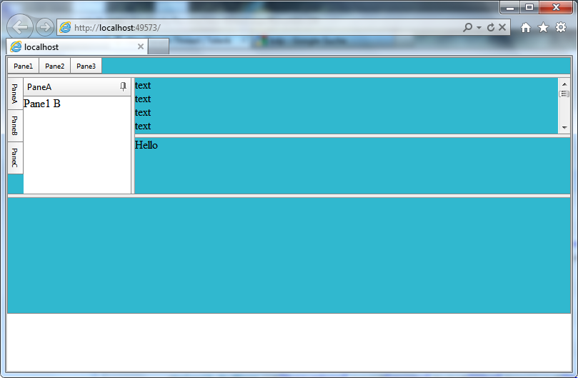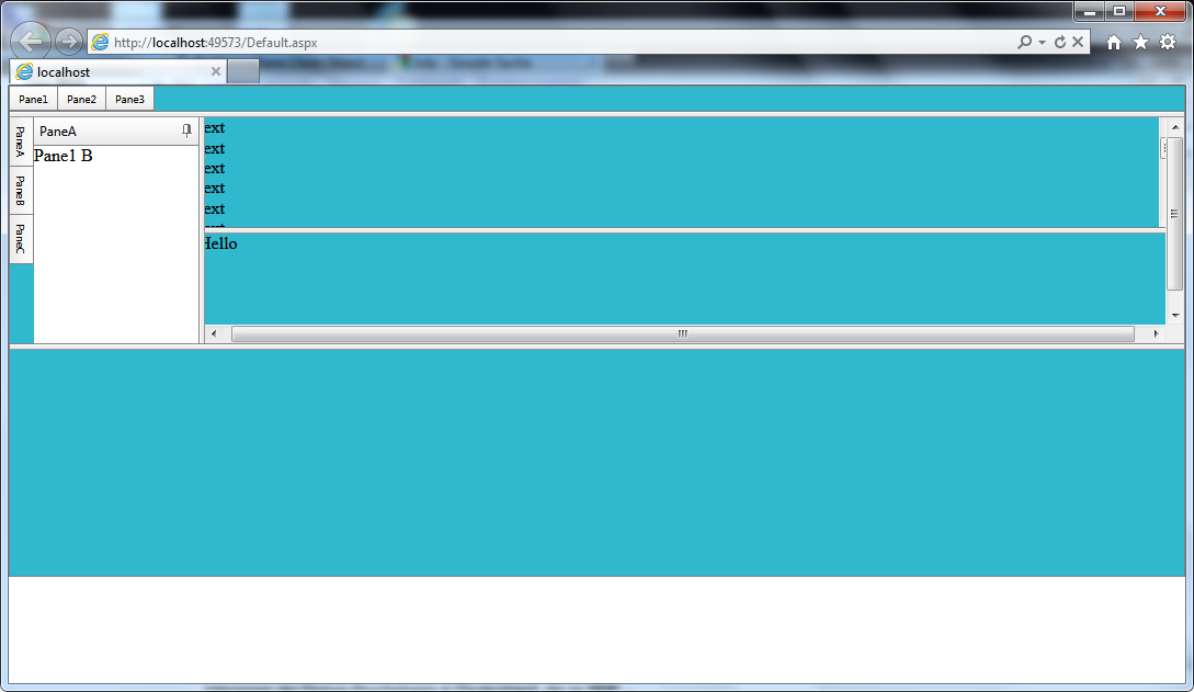 <telerik:RadSplitter ID="RadSplitter1" Height="100%" HeightOffset="80" runat="server"BackColor="#30B8CF" ClientIDMode="AutoID" SplitBarsSize="" LiveResize="False"ResizeMode="Proportional" Width="100%" Orientation="Horizontal" VisibleDuringInit="false"> <telerik:RadPane ID="TopPane" runat="server" Height="22px" Scrolling="none"> <telerik:RadSlidingZone ID="SlidingZone1" runat="server" Height="22px"> <telerik:RadSlidingPane ID="RadSlidingPane1" Title="Pane1" runat="server" Width="150px"> Pane 1 Content a </telerik:RadSlidingPane> <telerik:RadSlidingPane ID="Radslidingpane2" Title="Pane2" runat="server" Width="150px"> Pane 2 Content a </telerik:RadSlidingPane> <telerik:RadSlidingPane ID="Radslidingpane3" Title="Pane3" runat="server" Width="150px"> Pane 3 Content a </telerik:RadSlidingPane> </telerik:RadSlidingZone> </telerik:RadPane> <telerik:RadSplitBar ID="Radsplitbar1" runat="server" /> <telerik:RadPane ID="ContentPane" runat="server" Scrolling="None"> <telerik:RadSplitter ID="Radsplitter2" runat="server" Orientation="Vertical" LiveResize="False"ResizeMode="Proportional" VisibleDuringInit="false"> <telerik:RadPane ID="LeftContentPane" Width="22px" runat="server"> <telerik:RadSlidingZone ID="Radslidingzone2" runat="server" Width="22px" SlideDirection="Right"> <telerik:RadSlidingPane ID="Radslidingpane4" Title="PaneA" runat="server" Height="150px"> Pane1 B</telerik:RadSlidingPane> <telerik:RadSlidingPane ID="Radslidingpane8" Title="PaneB" runat="server" Height="150px"> Pane2 B</telerik:RadSlidingPane> <telerik:RadSlidingPane ID="Radslidingpane9" Title="PaneC" runat="server" Height="150px"> Pane3 B</telerik:RadSlidingPane> </telerik:RadSlidingZone> </telerik:RadPane> <telerik:RadSplitBar ID="Radsplitbar3" runat="server" /> <telerik:RadPane ID="Radpane2" runat="server"> <telerik:RadSplitter ID="RadSplitter3" Orientation="Horizontal" LiveResize="True"ResizeMode="Proportional" VisibleDuringInit="false" runat="server"> <telerik:RadPane ID="RightContentPaneTop" runat="server"> text<br /> text<br /> text<br /> text<br /> text<br /> text<br /> text<br /> text<br /> text<br /> text<br /> text<br /> text<br /> text<br /> text<br /> text<br /> text<br /> </telerik:RadPane> <telerik:RadSplitBar ID="RadSplitBar4" runat="server" /> <telerik:RadPane ID="RightContentPaneBottom" runat="server"> Hello </telerik:RadPane> </telerik:RadSplitter> </telerik:RadPane> </telerik:RadSplitter> </telerik:RadPane> <telerik:RadSplitBar ID="RadSplitBar2" runat="server" /> <telerik:RadPane ID="BottomPane" runat="server" Width="22px" Scrolling="None"> </telerik:RadPane> </telerik:RadSplitter>