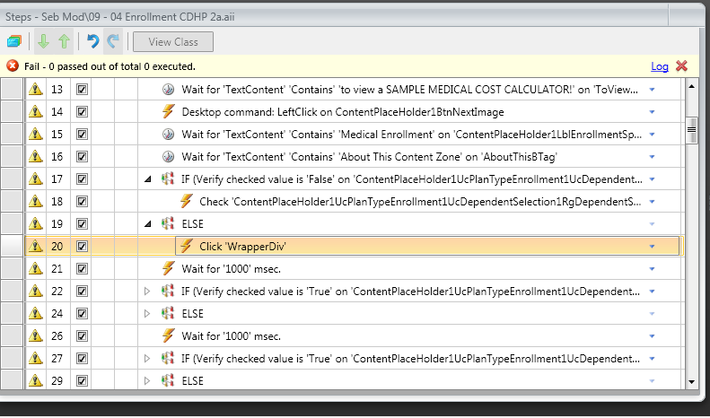 The yellow triangles containing exclamation marks simply signify that the step(s) did not execute. If the "If" verification is met, then the "Else" step and its action will not execute and will be marked with triangles. The opposite is true for the "If" step is its verification is not met and the "Else" step is executed instead. This does not mean an error occurred, just that the step(s) was skipped based on the logical statements.