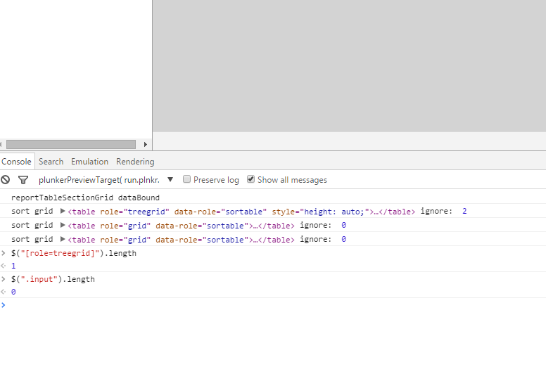 837: console.log("sort grid", currentGrid.table[0], "ignore: ", $(ignore).length);The output can be seen in the attached screen shot. It is obvious that the ignore selector for child grids does not match any elements.