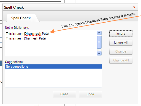 We have an issue were certain names are triggering spell check and the customer does not want this. We see there are parameters to exclude URL’s, email addresses, uppercase, etc. What we don’t see is the ability to create a custom text string exclusion list. Do any of your newer tools support this functionality, or is there a way to handle this in our current version with a code tweak? Can you provide me test code that provide ignore specific text or names from spell check.