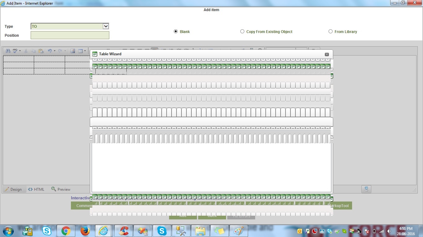 On click of table properties option, it opens a table wizard pop up which shows green and white combinations of lines.