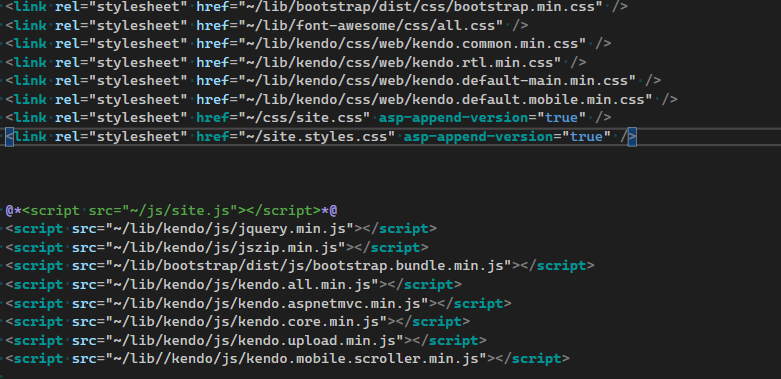 Then the kendo.aspnetmvc.min.js script is included, this is needed if you're using the ASP.NET Core/MVC wrappers.