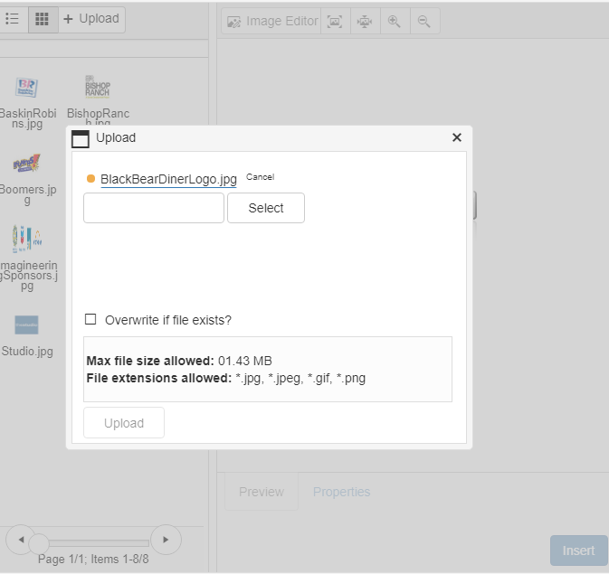 I select my image, and then the image name is on the Upload control, but has a Yellow circle to the left of the image name (see attached). There appears to be a progress bar (thin line under the image name) that goes to the end, yet the system just hangs there. Only think I can do is to cancel out of the upload.