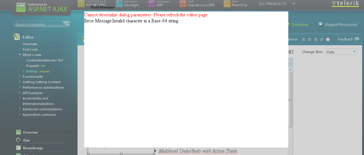 As to the "Invalid character in a Base-64 string." error see this article: Cannot Deserialize Dialog Parameters. Invalid character in a Base-64 string. The problem in the live demos is due to that the demos on our site are periodically reset to clean the changes made by the user and you should restart your browser when you get such an error.
