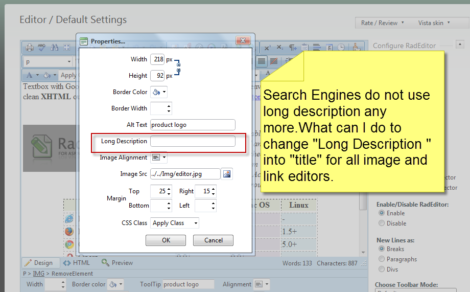 When I use the Image Manager to insert an image into the contents of the RadEditor a link like <img alt="" src="" longdesc="" /> is inserted (when I switch from the design view to the html view).