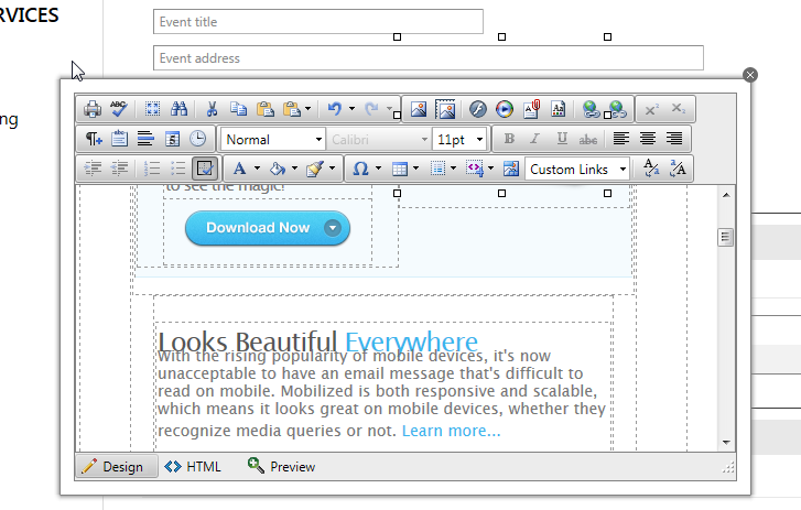 Hello, please see attached PNG that show the resize handles for a selected image. Notice that as I scroll down the handles are shown above the editor menu and outside the editor. The editor is shown within a tooltip. Everything else is working correctly. I am assuming this is a z-index issue. Note that I set the tooltip z-index to 2000 but that is the only z-index setting I set. Thank you!