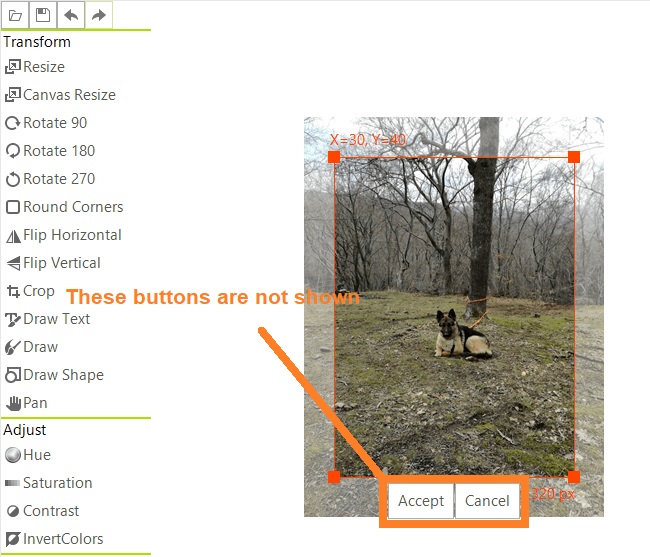 hi, i use imageEditor in my winform application, when i run application and try to use crop image with imageEditor the accept and cancel button doesn't shown... like attached picture. please help.