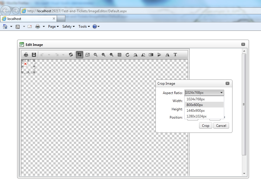 <!DOCTYPE html PUBLIC "-//W3C//DTD XHTML 1.0 Transitional//EN" "http://www.w3.org/TR/xhtml1/DTD/xhtml1-transitional.dtd"><!DOCTYPE html PUBLIC "-//W3C//DTD XHTML 1.0 Transitional//EN" "http://www.w3.org/TR/xhtml1/DTD/xhtml1-transitional.dtd"><html xmlns="http://www.w3.org/1999/xhtml"><head id="Head1" runat="server"> <title></title> <style type="text/css"> .rieDialogs { z-index: 5000; } </style></head><body> <form id="form1" runat="server"> <telerik:RadScriptManager ID="sm" runat="server" /> <telerik:RadWindow ID="winImageEditor" runat="server" VisibleStatusbar="false" ShowContentDuringLoad="false" Modal="false" Behaviors="Close,Move,Resize" Title="Edit Image" VisibleOnPageLoad="true"> <ContentTemplate> <telerik:RadImageEditor ID="iedImageEditor" runat="server"> </telerik:RadImageEditor> </ContentTemplate> </telerik:RadWindow> </form></body></html>Attached is cropDropdown.jpg showing the result in the browser.