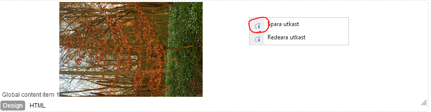 //Create a draft editor tool.EditorTool SaveDraftTool = new EditorTool();SaveDraftTool.Text = "Spara utkast";SaveDraftTool.Name = "SaveDraft" + this.ContentItemId.ToString(); //creating a unique command name so that correct article draft is saved.SaveDraftTool.ImageUrl = "/Modules/HtmlArticle/images/wysiwyg/icons/save-draft.png";SaveDraftTool.ImageUrlLarge = "/Modules/HtmlArticle/images/wysiwyg/icons/save-draft.png";EditorTool DeleteDraftTool = new EditorTool();DeleteDraftTool.Text = "Redeara utkast";DeleteDraftTool.Name = "DeleteDraft" + this.ContentItemId.ToString(); //creating a unique command name so that correct article draft is saved.DeleteDraftTool.ImageUrl = "/Modules/HtmlArticle/images/wysiwyg/icons/save-draft.png";DeleteDraftTool.ImageUrlLarge = "/Modules/HtmlArticle/images/wysiwyg/icons/save-draft.png";Hope this is enough information to figure out the problem... I can provide more information if required!!