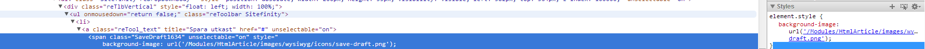string CustomCommandsCssStyle = "<style> ." + SaveDraftTool.Name + " { background-image: url('/Modules/HtmlArticle/images/wysiwyg/icons/save-draft.png'); } " + " ." + DeleteDraftTool.Name + " { background-image: url('/Modules/HtmlArticle/images/wysiwyg/icons/save-draft.png'); } </style>"; System.Web.UI.Page LoadedWebPage = (System.Web.UI.Page)HttpContext.Current.Handler; if (!LoadedWebPage.ClientScript.IsStartupScriptRegistered("savedraftandDeletedraftCss" + base.ContentItemId.ToString())) LoadedWebPage.ClientScript.RegisterStartupScript(this.GetType(), "savedraftandDeletedraftCss" + base.ContentItemId.ToString(), CustomCommandsCssStyle);It is adding the style in page as i can see it in page source, but still no images are appearing??