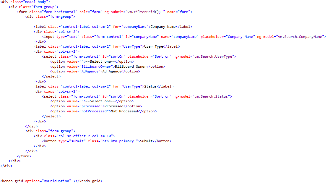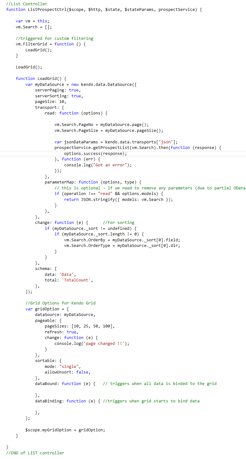 I have implement grid finally. Previously I could do it with less effort but now by using angular js, it has become really painful. I have posted code. I have my api to load data and api expects parameters. I cannot change api's parameter to make it inline with the kendoGrid's request object. So I have created own view model and assigned the required parameters.