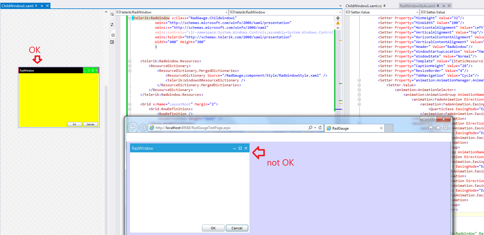 <telerik:RadWindow x:Class="RadGauge.ChildWindow1" xmlns:controls="clr-namespace:System.Windows.Controls;assembly=System.Windows.Controls" xmlns:telerik="http://schemas.telerik.com/2008/xaml/presentation" Width="400" Height="300" > <telerik:RadWindow.Resources> <ResourceDictionary> <ResourceDictionary.MergedDictionaries> <ResourceDictionary Source="/RadGauge;component/Style/RadWindowStyle.xaml" /> <telerik:Windows8ResourceDictionary /> </ResourceDictionary.MergedDictionaries> </ResourceDictionary> </telerik:RadWindow.Resources> <Grid x:Name="LayoutRoot" Margin="2"> <Grid.RowDefinitions> <RowDefinition /> <RowDefinition Height="Auto" /> </Grid.RowDefinitions> <Button x:Name="CancelButton" Content="Cancel" Click="CancelButton_Click" Width="75" Height="23" HorizontalAlignment="Right" Margin="0,12,0,0" Grid.Row="1" /> <Button x:Name="OKButton" Content="OK" Click="OKButton_Click" Width="75" Height="23" HorizontalAlignment="Right" Margin="0,12,79,0" Grid.Row="1" /> </Grid></telerik:RadWindow>using System;using System.Collections.Generic;using System.Linq;using System.Net;using System.Windows;using System.Windows.Controls;using System.Windows.Documents;using System.Windows.Input;using System.Windows.Media;using System.Windows.Media.Animation;using System.Windows.Shapes;using Telerik.Windows.Controls;namespace RadGauge{ public partial class ChildWindow1 : RadWindow { public ChildWindow1() { InitializeComponent(); } private void OKButton_Click(object sender, RoutedEventArgs e) { this.DialogResult = true; } private void CancelButton_Click(object sender, RoutedEventArgs e) { this.DialogResult = false; } }}Style xaml