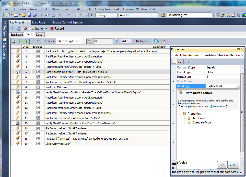 Have you seen this video regarding the data-binding abilities of WebUI Test Studio? Please let us know if this helps or if you need further assistance.