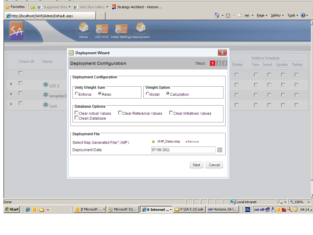 <%@ Control Language="C#" AutoEventWireup="true" CodeBehind="DeploymentWizard.ascx.cs" Inherits="Horizons.SA.Presentation.UI.Web.Client.Admin.Controls.DeploymentWizard" %> <%@ Register Assembly="Telerik.Web.UI" Namespace="Telerik.Web.UI" TagPrefix="telerik" %> <style type="text/css"> </style> <telerik:RadCodeBlock ID="RadCodeBlock1" runat="server"> <script type="text/javascript"> function OpenDeploymentWizard() { var RadWindow = $find("<%=RadDeploymentWindow.ClientID%>"); RadWindow.show(); } function CloseDeploymentWizard() { var RadWindow = $find("<%=RadDeploymentWindow.ClientID%>"); RadWindow.Close(); } </script> </telerik:RadCodeBlock> <telerik:RadAjaxManager runat="server" ID="RadAjaxManager"> <AjaxSettings> <telerik:AjaxSetting AjaxControlID="RadDeploymentWindow"> <UpdatedControls> <telerik:AjaxUpdatedControl ControlID="RadDeploymentWindow" /> </UpdatedControls> </telerik:AjaxSetting> </AjaxSettings> </telerik:RadAjaxManager> <telerik:RadWindow ID="RadDeploymentWindow" Title="<%$ Resources:Text, DeploymentWizard %>" runat="server" VisibleOnPageLoad="false" VisibleStatusbar="false" Width="535px" Modal="true" Height="430px" Behaviors="Close,Move" Skin="Windows7" ShowContentDuringLoad="false" EnableViewState="false" DestroyOnClose="true" ReloadOnShow="true"> <ContentTemplate> <%--Deployment Wizards--%> <asp:Wizard runat="server" ID="DeployWizards" Width="100%" DisplaySideBar="False" DisplayCancelButton="true" OnNextButtonClick="DeployWizards_NextButtonClick"> <HeaderTemplate> <table cellpadding="0" cellspacing="0" class="wizardHeader"> <tr> <td class="wizardTitle"> <%= DeployWizards.ActiveStep.Title%> </td> <td> <table style="width: 100%; border-collapse: collapse;"> <tr> <td class="wizardHeaderTableCell"> <span class="wizardProgress"> <%= Resources.Text.Steps%></span> </td> <asp:Repeater ID="SideBarList" runat="server"> <ItemTemplate> <td class="stepBreak"> </td> <td class="<%# GetClassForWizardStep(Container.DataItem) %>" title="<%# DataBinder.Eval(Container, "DataItem.Name")%>"> <%# DeployWizards.WizardSteps.IndexOf(Container.DataItem as TemplatedWizardStep ) + 1%> </td> </ItemTemplate> </asp:Repeater> </tr> </table> </td> </tr> </table> </HeaderTemplate> <StartNavigationTemplate> <asp:Panel ID="panStart" runat="server" CssClass="wizardNavContent"> <telerik:RadButton ID="NextButtonValidationStep" CssClass="wizardNavButton" runat="server" Text="<%$ Resources:Text, Next %>" CommandName="MoveNext" AlternateText="Next"> </telerik:RadButton> <telerik:RadButton ID="CancelButtonValidationStep" CssClass="wizardNavButton" runat="server" Text="<%$ Resources:Text, Cancel %>" AlternateText="Cancel" OnClientClicked="CloseDeploymentWizard"> </telerik:RadButton> </asp:Panel> </StartNavigationTemplate> <StepNavigationTemplate> <asp:Panel ID="panStep" runat="server" CssClass="wizardNavContent"> <telerik:RadButton ID="PrevButtonDeployment" CssClass="wizardNavButton" runat="server" Text="<%$ Resources:Text, Previous %>" CommandName="MovePrevious" AlternateText="Previous"> </telerik:RadButton> <telerik:RadButton ID="NextButtonDeploymentStep" CssClass="wizardNavButton" runat="server" Text="<%$ Resources:Text, Next %>" CommandName="MoveNext" AlternateText="Next"> </telerik:RadButton> <telerik:RadButton ID="CancelButtonDeploymentStep" CssClass="wizardNavButton" runat="server" Text="<%$ Resources:Text, Cancel %>" AlternateText="Cancel" OnClientClicked="CloseDeploymentWizard"> </telerik:RadButton> </asp:Panel> </StepNavigationTemplate> <FinishNavigationTemplate> <asp:Panel ID="panFinish" runat="server" CssClass="wizardNavContent"> <telerik:RadButton ID="FinishButton" CssClass="wizardNavButton" runat="server" CommandName="MoveComplete" OnClientClicked="CloseDeploymentWizard" Text="<%$ Resources:Text, Finish %>" AlternateText="Finish"> </telerik:RadButton> </asp:Panel> </FinishNavigationTemplate> <WizardSteps> <asp:TemplatedWizardStep ID="DeploymentConfigurationStep" runat="server" Title="<%$ Resources:Text, DeploymentConfiguration %>"> <ContentTemplate> <div class="WizardContent"> <div> <fieldset class="DeploymentFieldset"> <legend class="Deploymentlegend"> <%= Resources.Text.DeploymentConfiguration%></legend> <table cellpadding="0" cellspacing="0" style="width: 100%;"> <tr> <td> <div style="width: 100%;"> <fieldset style="margin-right: 5px;" class="DeploymentFieldset"> <legend class="Deploymentlegend"> <%= Resources.Text.UnityWeightSum%></legend> <SA:RadioButton ID="RadioButtonEnforce" runat="server" GroupName="UnityWeightSum" Checked="true" Text="Enforce" /> <SA:RadioButton ID="RadioButtonRelax" CssClass="RadioButtonImportContinue" runat="server" GroupName="UnityWeightSum" Text="Relax" /> </fieldset> </div> </td> <td> <div style="width: 100%;"> <fieldset class="DeploymentFieldset"> <legend class="Deploymentlegend"> <%= Resources.Text.WeightOption%></legend> <SA:RadioButton ID="RadioButtonModel" runat="server" GroupName="WeightOption" Checked="true" Text="Model" /> <SA:RadioButton ID="RadioButtonCalculation" CssClass="RadioButtonImportContinue" runat="server" GroupName="WeightOption" Text="Calculation" /> </fieldset> </div> </td> </tr> <tr> <td colspan="2"> <div style="width: 100%;"> <fieldset class="DeploymentFieldset"> <legend class="Deploymentlegend"> <%= Resources.Text.DatabaseOptions%></legend> <SA:CheckBox Checked="false" CssClass="DeploymentDatabaseOption" Text="<%$ Resources:Text, ClearActualValues %>" ID="CheckBoxRunInBackground" runat="server" /> <SA:CheckBox Checked="false" CssClass="DeploymentDatabaseOption" Text="<%$ Resources:Text, ClearReferenceValues %>" ID="CheckBox1" runat="server" /> <SA:CheckBox Checked="false" CssClass="DeploymentDatabaseOption" Text="<%$ Resources:Text, ClearInitiativesValues %>" ID="CheckBox2" runat="server" /> <SA:CheckBox Checked="false" CssClass="DeploymentDatabaseOption" Text="<%$ Resources:Text, CleanDatabase %>" ID="CheckBox3" runat="server" /> </fieldset> </div> </td> </tr> </table> </fieldset> </div> <div class="DeploymentFile"> <fieldset class="DeploymentFiel