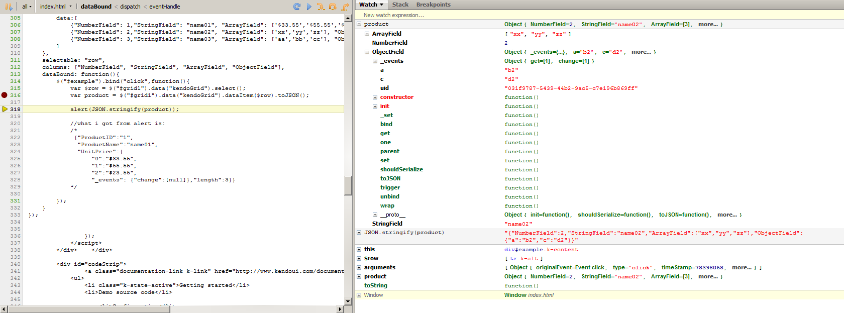 As you see, from JSON.stringify(product), I get some Kendo added cruft like _events and change and length. On top of this, the value of UnitPrice has been converted to a dictionary/json object instead of its original array. What I really need is to obtain the original data structure for that row.