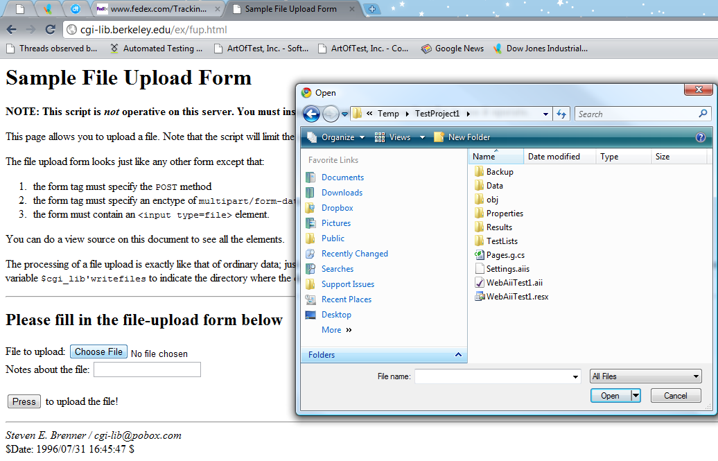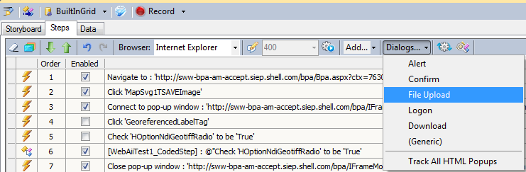 During recording of a WebAii test we try to automatically handle recording a "Handle FileUpload Dialog" test step. We don't record the individual actions you perform in the dialog, but rather add this one step automatically when you click the Open/Save/Cancel button. This means when you click one of the buttons we'll automatically read the file & path entered and which button you clicked. We'll populate the properties of the test step with these values.