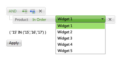 In order to achieve your scenario you could use a Contains which is for your example ProductList 15, 16, 17, 18, 19 which could be Contains "15, " OR Contains ", 15". Note that we are currently working on improving RadFilter API so these kind of operations are easier to achieve. However, currently you should manually swap each of the Contains expression for two Contains expressions as described above in the ApplyExpressions event and applying the technique shown in the help topic below.