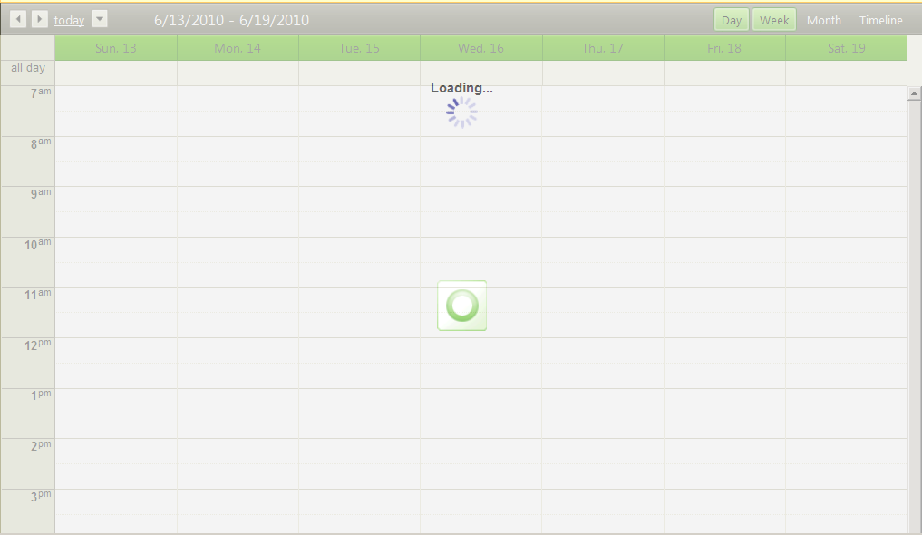 <%@ Page Language="C#" %><%@ Import Namespace="System.Data" %><%@ Register Assembly="Telerik.Web.UI" Namespace="Telerik.Web.UI" TagPrefix="telerik" %><script runat="server">protected void RadGrid_NeedDataSource(object sender, GridNeedDataSourceEventArgs e){ DataTable dt = new DataTable(); DataRow dr; int colsNum = 4; int rowsNum = 50; string colName = "Column"; for (int j = 1; j <= colsNum; j++) { dt.Columns.Add(String.Format("{0}{1}", colName, j)); } for (int i = 1; i <= rowsNum; i++) { dr = dt.NewRow(); for (int k = 1; k <= colsNum; k++) { dr[String.Format("{0}{1}", colName, k)] = String.Format("{0}{1} Row{2}", colName, k, i); } dt.Rows.Add(dr); } (sender as RadGrid).DataSource = dt;} </script><!DOCTYPE html PUBLIC "-//W3C//DTD XHTML 1.0 Transitional//EN"<html xmlns="http://www.w3.org/1999/xhtml"><head runat="server"><meta http-equiv="content-type" content="text/html;charset=utf-8" /><title>RadControls</title><style type="text/css">.rgStatus2 *{ visibility:hidden !important;}</style></head><body><form id="form1" runat="server"><asp:ScriptManager ID="ScriptManager1" runat="server" /><telerik:RadAjaxManager ID="RadAjaxManager1" runat="server" DefaultLoadingPanelID="RadAjaxLoadingPanel1"> <AjaxSettings> <telerik:AjaxSetting AjaxControlID="RadGrid1"> <UpdatedControls> <telerik:AjaxUpdatedControl ControlID="RadGrid1" /> </UpdatedControls> </telerik:AjaxSetting> </AjaxSettings></telerik:RadAjaxManager><asp:CheckBox ID="CheckBox1" runat="server" onclick="toggleAnimation(this)" Checked="true" /><telerik:RadCodeBlock ID="RadCodeBlock1" runat="server"><script type="text/javascript">function toggleAnimation(chkBox){ var statusCell = $telerik.getElementByClassName($get("<%= RadGrid1.ClientID %>"), "rgStatus", "td"); if (chkBox.checked) Sys.UI.DomElement.removeCssClass(statusCell, "rgStatus2"); else Sys.UI.DomElement.addCssClass(statusCell, "rgStatus2");}function checkAnimationSetting(sender, args){ var chkBox = $get("<%= CheckBox1.ClientID %>"); if (chkBox && !chkBox.checked) { var statusCell = $telerik.getElementByClassName(sender.get_element(), "rgStatus", "td"); Sys.UI.DomElement.addCssClass(statusCell, "rgStatus2"); }}</script></telerik:RadCodeBlock><telerik:RadGrid ID="RadGrid1" runat="server" Skin="Office2007" Width="800px" ShowStatusBar="true" AllowPaging="true" OnNeedDataSource="RadGrid_NeedDataSource"> <ClientSettings> <ClientEvents OnGridCreated="checkAnimationSetting" /> </ClientSettings></telerik:RadGrid> </form></body></html>>> I see the RadScheduler with its own loading animation too.