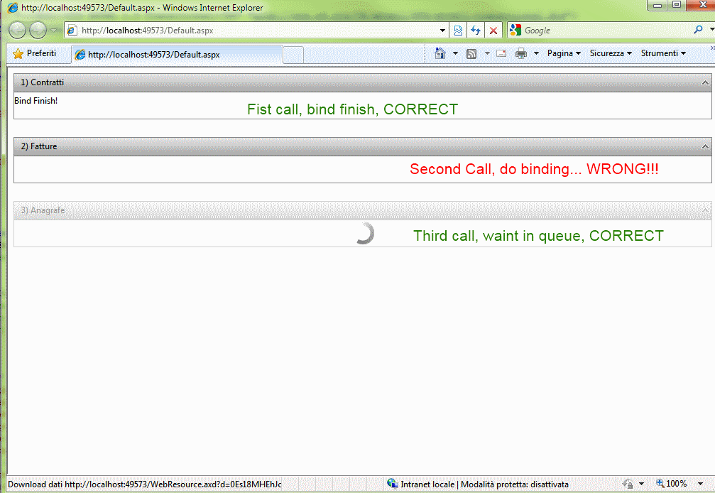 <%@ Page Language="C#" AutoEventWireup="true" CodeBehind="Default.aspx.cs" Inherits="Default" %> <!DOCTYPE html PUBLIC "-//W3C//DTD XHTML 1.0 Transitional//EN" "http://www.w3.org/TR/xhtml1/DTD/xhtml1-transitional.dtd"> <html xmlns="http://www.w3.org/1999/xhtml"> <head runat="server"> <title></title> <telerik:RadStyleSheetManager ID="RadStyleSheetManager1" runat="server" /> <style type="text/css"> .panelBoxOut { min-height: 90px; } .panelBoxIn { min-height: 35px; } </style> </head> <body> <script type="text/javascript"> function OnExpand(sender, eventArgs) { //logEvent("On expand: " + eventArgs.get_item().get_text()); } function OnCollapse(sender, eventArgs) { //logEvent("On collapse: " + eventArgs.get_item().get_text()); //how to Stop postback??? return false; } </script> <form id="form1" runat="server"> <asp:ScriptManager ID="ScriptManager1" runat="server"> </asp:ScriptManager> <telerik:RadAjaxManager ID="RadAjaxManager1" runat="server" RequestQueueSize="10"> <AjaxSettings> <telerik:AjaxSetting AjaxControlID="RadAjaxPanelFatture"> </telerik:AjaxSetting> <telerik:AjaxSetting AjaxControlID="RadAjaxPanelContratti"> </telerik:AjaxSetting> </AjaxSettings> </telerik:RadAjaxManager> <telerik:RadAjaxLoadingPanel ID="RadAjaxLoadingPanel1" runat="server" Skin="Default"> </telerik:RadAjaxLoadingPanel> <telerik:RadAjaxLoadingPanel ID="RadAjaxLoadingPanel2" runat="server" Skin="Default"> </telerik:RadAjaxLoadingPanel> <telerik:RadAjaxLoadingPanel ID="RadAjaxLoadingPanel3" runat="server" Skin="Default"> </telerik:RadAjaxLoadingPanel> <div> <div> <telerik:RadAjaxPanel ID="RadAjaxPanel1Contratti" runat="server" LoadingPanelID="RadAjaxLoadingPanel1"> <telerik:RadPanelBar runat="server" ID="RadPanelBarContratti" AllowCollapseAllItems="True" Width="100%" CssClass="panelBoxOut" OnClientItemExpand="OnExpand" OnClientItemCollapse="OnCollapse" OnItemClick="RadPanelBarContratti_ItemClick"> <Items> <telerik:RadPanelItem Text="1) Contratti" Value="pnlDataAnagafica"> <Items> <telerik:RadPanelItem Value="Grid"> <ItemTemplate> <div class="panelBoxIn"> <%--<telerik:RadGrid ID="grdContratti" runat="server" DataSourceID="ObjectDataSourceContratti" GridLines="None" Visible="False" AutoGenerateColumns="False"> <MasterTableView> </MasterTableView> </telerik:RadGrid>--%> <asp:Label ID="Label1" runat="server" Text=""></asp:Label> </div> </ItemTemplate> </telerik:RadPanelItem> </Items> </telerik:RadPanelItem> </Items> </telerik:RadPanelBar> </telerik:RadAjaxPanel> </div> <div> <telerik:RadAjaxPanel ID="RadAjaxPanelFatture" runat="server" LoadingPanelID="RadAjaxLoadingPanel2"> <telerik:RadPanelBar runat="server" ID="RadPanelBarFatture" CssClass="panelBoxOut" AllowCollapseAllItems="false" Width="100%" OnClientItemExpand="OnExpand" OnClientItemCollapse="OnCollapse" OnItemClick="RadPanelBarFatture_ItemClick"> <Items> <telerik:RadPanelItem Text="2) Fatture" Value="pnlDataAnagafica"> <Items> <telerik:RadPanelItem Value="Grid"> <ItemTemplate> <div class="panelBoxIn"> <%-- <telerik:RadGrid ID="grdFatture" runat="server" DataSourceID="ObjectDataSourceFatture" GridLines="None" Visible="False" AutoGenerateColumns="False" OnGridCreated="OnGridCreated" AllowPaging="True" PageSize="15"> <MasterTableView> </MasterTableView> </telerik:RadGrid>--%> <asp:Label ID="Label1" runat="server" Text=""></asp:Label> </div> </ItemTemplate> </telerik:RadPanelItem> </Items> </telerik:RadPanelItem> </Items> </telerik:RadPanelBar> </telerik:RadAjaxPanel> </div> <div> <telerik:RadAjaxPanel ID="RadAjaxPanel1" runat="server" LoadingPanelID="RadAjaxLoadingPanel3"> <telerik:RadPanelBar runat="server" ID="RadPanelBarBarAnagrafe" CssClass="panelBoxOut" AllowCollapseAllItems="false" Width="100%" OnClientItemExpand="OnExpand" OnClientItemCollapse="OnCollapse" OnItemClick="RadPanelBarAnagrafe_ItemClick"> <Items> <telerik:RadPanelItem Text="3) Fatture" Value="pnlDataAnagafica"> <Items> <telerik:RadPanelItem Value="Grid"> <ItemTemplate> <div class="panelBoxIn"> <%-- <telerik:RadGrid ID="grdFatture" runat="server" DataSourceID="ObjectDataSourceFatture" GridLines="None" Visible="False" AutoGenerateColumns="False" OnGridCreated="OnGridCreated" AllowPaging="True" PageSize="15"> <MasterTableView> </MasterTableView> </telerik:RadGrid>--%> <asp:Label ID="Label1" runat="server" Text=""></asp:Label> </div> </ItemTemplate> </telerik:RadPanelItem> </Items> </telerik:RadPanelItem> </Items> </telerik:RadPanelBar> </telerik:RadAjaxPanel> </div> </div> </form> </body> </html> using System; using System.Web; using System.Web.UI; using System.Web.UI.WebControls; using System.Data; using System.Configuration; using System.Web.Security; using System.Web.UI.WebControls.WebParts; using System.Web.UI.HtmlControls; using Telerik.Web.UI; public partial class Default : System.Web.UI.Page { protected void Page_Load(object sender, EventArgs e) { } protected void RadPanelBarContratti_ItemClick(object sender, RadPanelBarEventArgs e) { /* RadGrid grdContratti = (RadGrid)RadPanelBarContratti.FindItemByValue("Grid").FindControl("grdContratti"); if (!grdContratti.Visible) { grdContratti.Visible = true; base.ConfigGrid(ref grdContratti); //grdContratti.DataBind(); } */ //Simulate grid bind time with thread System.Threading.Thread.Sleep(15000); Label lblContratti = (Label)RadPanelBarContratti.FindItemByValue("Grid").FindControl("Label1"); lblContratti.Text = "Bind Finish!"; } protected void RadPanelBarFatture_ItemClick(object sender, RadPanelBarEventArgs e) { /* RadGrid grdFatture = (RadGrid)RadPanelBarFatture.FindItemByValue("Grid").FindControl("grdFatture"); if (!grdFatture.Visible) { grdFatture.Visible = true; base.ConfigGrid(ref grdFatture); //grdFatture.DataBind(); } */ //Simulate grid bind time with thread System.Threading.Thread.Sleep(10000); Label lblContratti = (Label)RadPanelBarFatture.FindItemByValue("Grid").FindControl("Label1"); lblContratti.Text = "Bind Finish!"; } protected void RadPanelBarAnagrafe_ItemClick(object sender, RadPanelBarEventArgs e) { /* RadGrid grdFatture = (RadGrid)RadPa