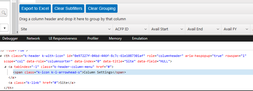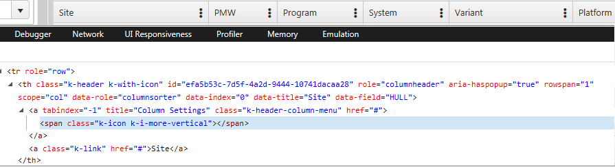 With the new Kendo version, the column settings icons in the column headers are 3 vertical dots instead of a caret. When I inspect a column header element, I see that the span is using class 'k-icon k-i-more-vertical'. Our production site still has the previous Kendo version, and inspecting the column header element shows that the span is using class 'k-icon k-i-arrowhead-s'.
