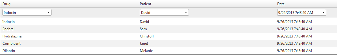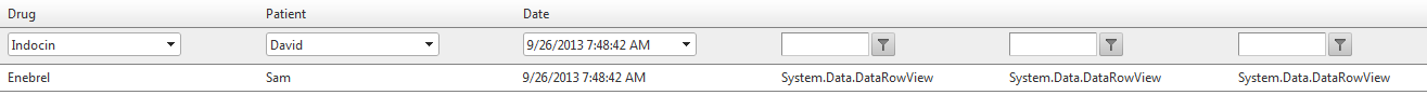 DataTable dt; RadGrid RadGrid1; private void Page_Init(object sender, System.EventArgs e) { RadGrid1 = new RadGrid(); RadGrid1.ID = "RadGrid1"; RadGrid1.AutoGenerateColumns = false; RadGrid1.AllowPaging = true; RadGrid1.AllowSorting = true; RadGrid1.AllowFilteringByColumn = true; RadGrid1.EnableLinqExpressions = false; RadGrid1.PagerStyle.AlwaysVisible = true; RadGrid1.NeedDataSource += new GridNeedDataSourceEventHandler(RadGrid1_NeedDataSource); dt = GetDataTable("SELECT Country FROM Customers"); string ColumnName = "Country"; GridBoundColumn templateColumn; templateColumn = new GridBoundColumn(); templateColumn.FilterTemplate = new MyTemplate(ColumnName,RadGrid1); templateColumn.DataField = ColumnName; templateColumn.HeaderText = ColumnName; templateColumn.UniqueName = ColumnName; this.RadGrid1.MasterTableView.Columns.Add(templateColumn); GridBoundColumn boundColumn; boundColumn = new GridBoundColumn(); RadGrid1.MasterTableView.Columns.Add(boundColumn); boundColumn.DataField = "CompanyName"; boundColumn.HeaderText = "CompanyName"; boundColumn = new GridBoundColumn(); RadGrid1.MasterTableView.Columns.Add(boundColumn); boundColumn.DataField = "ContactName"; boundColumn.HeaderText = "Contact Name"; PlaceHolder1.Controls.Add(RadGrid1); } private class MyTemplate : ITemplate { DataTable dt; protected RadComboBox combo; private string colname; RadGrid radgrid; public MyTemplate(string cName,RadGrid grid) { colname = cName; radgrid = grid; } public void InstantiateIn(System.Web.UI.Control container) { combo = new RadComboBox(); combo.ID = "lControl"; combo.DataBinding += new EventHandler(lControl_DataBinding); container.Controls.Add(combo); combo.AutoPostBack = true; combo.SelectedIndexChanged += new RadComboBoxSelectedIndexChangedEventHandler(l_SelectedIndexChanged); } public void lControl_DataBinding(object sender, EventArgs e) { RadComboBox l = (RadComboBox)sender; GridFilteringItem container = (GridFilteringItem)l.NamingContainer; l.DataTextField = colname; l.DataValueField = colname; dt = GetDataTable("SELECT distinct Country FROM Customers"); l.DataSource = dt; } void l_SelectedIndexChanged(object sender, RadComboBoxSelectedIndexChangedEventArgs e) { RadComboBox combo = sender as RadComboBox; string filterExpression; filterExpression = "([Country] LIKE '" + e.Value + "')"; radgrid.MasterTableView.FilterExpression = filterExpression; radgrid.MasterTableView.Rebind(); } } protected void RadGrid1_NeedDataSource(object source, GridNeedDataSourceEventArgs e) { dt = GetDataTable("SELECT CompanyName, ContactName, Country FROM Customers"); this.RadGrid1.DataSource = dt; } public static DataTable GetDataTable(string query) { string ConnString = ConfigurationManager.ConnectionStrings["Northwind_newConnectionString3"].ConnectionString; SqlConnection conn = new SqlConnection(ConnString); SqlDataAdapter adapter = new SqlDataAdapter(); adapter.SelectCommand = new SqlCommand(query, conn); DataTable myDataTable = new DataTable(); conn.Open(); try { adapter.Fill(myDataTable); } finally { conn.Close(); } return myDataTable; }Thanks,