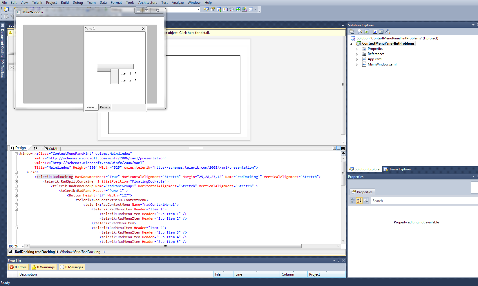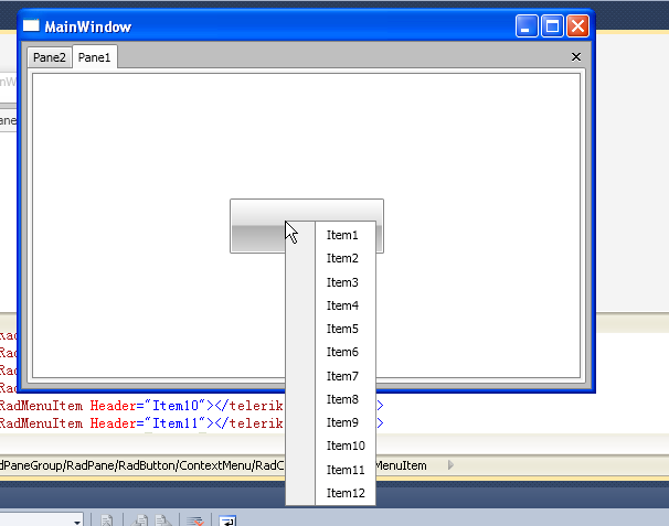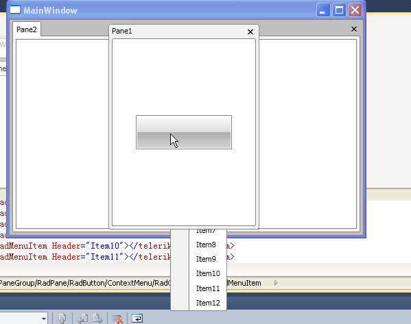 <Window x:Class="RadControlsWpfApp2.MainWindow" xmlns:telerik="http://schemas.telerik.com/2008/xaml/presentation" Title="MainWindow" Height="350" Width="525"> <telerik:RadDocking > <telerik:RadSplitContainer> <telerik:RadPaneGroup > <telerik:RadPane Header="Pane1"> <telerik:RadButton Width="140" Height="50"> <telerik:RadContextMenu.ContextMenu> <telerik:RadContextMenu> <telerik:RadMenuItem Header="Item1"></telerik:RadMenuItem> <telerik:RadMenuItem Header="Item2"></telerik:RadMenuItem> <telerik:RadMenuItem Header="Item3"></telerik:RadMenuItem> <telerik:RadMenuItem Header="Item4"></telerik:RadMenuItem> <telerik:RadMenuItem Header="Item5"></telerik:RadMenuItem> <telerik:RadMenuItem Header="Item6"></telerik:RadMenuItem> <telerik:RadMenuItem Header="Item7"></telerik:RadMenuItem> <telerik:RadMenuItem Header="Item8"></telerik:RadMenuItem> <telerik:RadMenuItem Header="Item9"></telerik:RadMenuItem> <telerik:RadMenuItem Header="Item10"></telerik:RadMenuItem> <telerik:RadMenuItem Header="Item11"></telerik:RadMenuItem> <telerik:RadMenuItem Header="Item12"></telerik:RadMenuItem> </telerik:RadContextMenu> </telerik:RadContextMenu.ContextMenu> </telerik:RadButton> </telerik:RadPane> <telerik:RadPane Header="Pane2" /> </telerik:RadPaneGroup> </telerik:RadSplitContainer> </telerik:RadDocking> </Window>0
