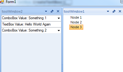 using System;using System.Collections.Generic;using System.ComponentModel;using System.Data;using System.Drawing;using System.Linq;using System.Text;using System.Windows.Forms;namespace Sample{ public partial class Form1 : Form { public Form1() { InitializeComponent(); } private void Form1_Load(object sender, EventArgs e) { radTreeView1.Nodes.Add("Node 1"); radTreeView1.Nodes.Add("Node 2"); radTreeView1.Nodes.Add("Node 3"); } private ComboBox CreateCombo() { ComboBox _cmb = new ComboBox(); _cmb.Visible = true; _cmb.DataSource = CreateDataSource(); _cmb.DisplayMember = "Display"; _cmb.ValueMember = "Value"; return _cmb; } private DataTable CreateDataSource() { //create datatable for combo datasource DataTable _dt = new DataTable("Data"); _dt.Columns.Add("Value", Type.GetType("System.Int32")); _dt.Columns.Add("Display", Type.GetType("System.String")); DataRow _row = _dt.NewRow(); _row[0] = (int)0; _row[1] = " -- Select --"; _dt.Rows.Add(_row); _row = _dt.NewRow(); _row[0] = (int)1; _row[1] = "ComboBox Value: Something 1"; _dt.Rows.Add(_row); _row = _dt.NewRow(); _row[0] = (int)2; _row[1] = "ComboBox Value: Something 2"; _dt.Rows.Add(_row); return _dt; } private void DisposeControls() { int _cnt = panel1.Controls.Count; for (int i = _cnt - 1; i > -1; i--) { Control _cntrl = panel1.Controls[i]; panel1.Controls.Remove(_cntrl); _cntrl.Dispose(); } } private void radTreeView1_SelectedNodeChanged(object sender, Telerik.WinControls.UI.RadTreeViewEventArgs e) { DisposeControls(); ComboBox _cmb1 = CreateCombo(); _cmb1.Dock = DockStyle.Top; TextBox _txt1 = new TextBox(); _txt1.Dock = DockStyle.Top; switch (radTreeView1.SelectedNode.Text) { case "Node 1": panel1.Controls.Add(_cmb1); _cmb1.SelectedValue = 1; break; case "Node 2": panel1.Controls.Add(_txt1); _txt1.Text = "Nod2: Hello World"; break; case "Node 3": panel1.Controls.Add(_cmb1); panel1.Controls.Add(_txt1); _txt1.Text = "Node 3: Hello Again"; _cmb1.SelectedValue = 2; break; } } }}The controls are created and added to the tool window dynamically at runtime which is dependant on the current node. Set the ToolWindow2.DockState to AutoHide then change nodes. You'll see that the ComboBox.SelectedValue remains null. If you use SelectedIndex, you'll end up with an exception error. This only happens with ComboBoxes and only happens if the ToolWindow.DockState = AutoHide when the controls are created and added to it.