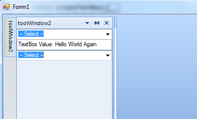 public static class ControlManager { private static Panel _pnlPropertyControls; private static BindingContext _bindingContext; public static void InitializeControlManager(Panel CntrlParentContainer, BindingContext CntrlBindingContext) { _pnlPropertyControls = CntrlParentContainer; _bindingContext = CntrlBindingContext; } private static ComboBox CreateComboBox() { ComboBox _cmb = new ComboBox(); _cmb.DataSource = CreateDataSource(); _cmb.ValueMember = "Value"; _cmb.DisplayMember = "Display"; _cmb.Visible = true; _cmb.BindingContext = _bindingContext; return _cmb; }}Unfortunately.......... Now, I have a new issue that I didn't have previously with the ToolWindow.DockState = AutoHide.