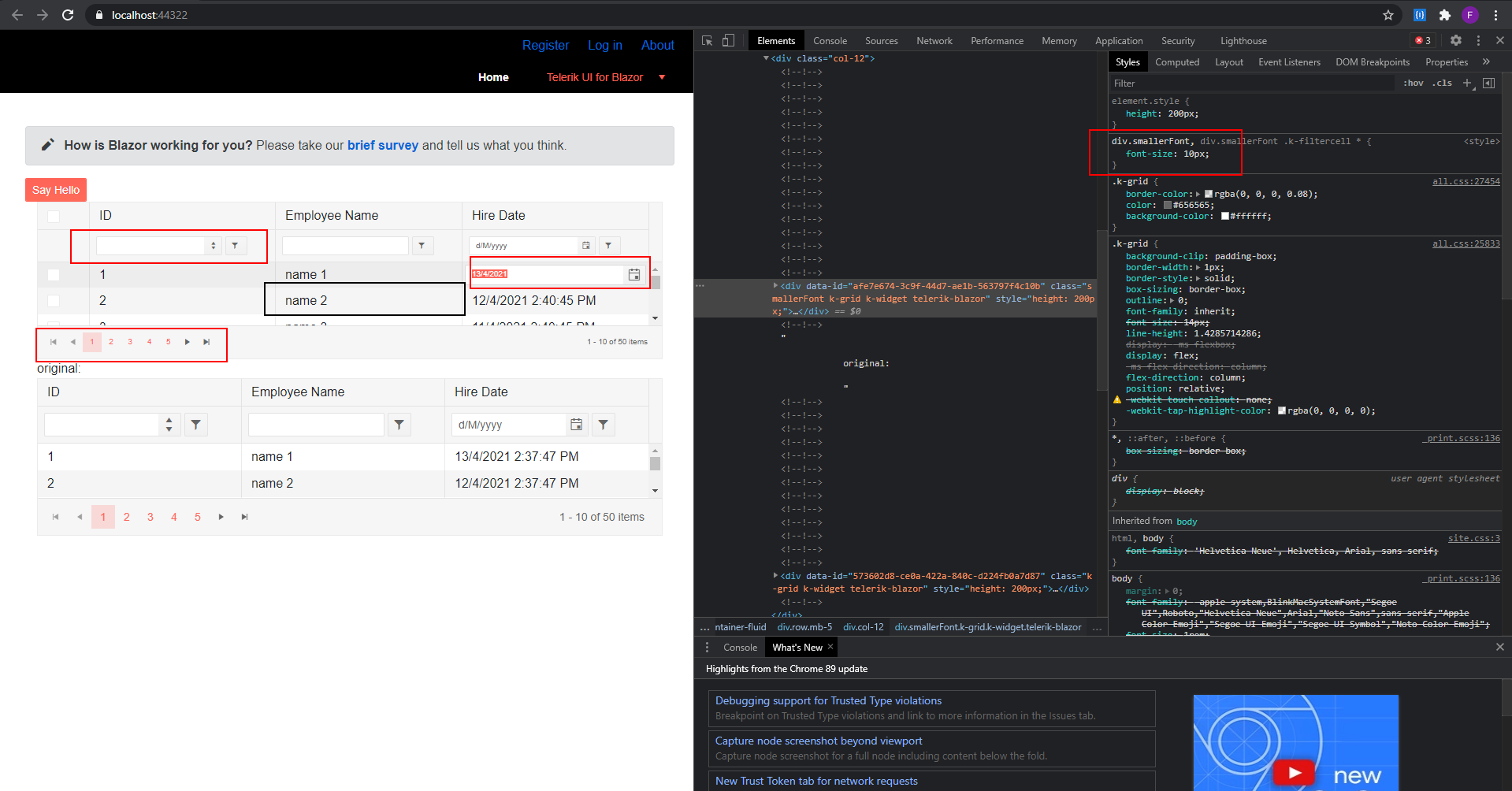 <TelerikGrid Class="smallerFont" Data="@traveller.P_RunInfos" Height="600px" FilterMode="Telerik.Blazor.GridFilterMode.FilterRow" EditMode="@GridEditMode.Incell" Resizable="true" SelectionMode="@GridSelectionMode.Multiple" @bind-SelectedItems="traveller.P_SelectedRunInfos"> @*<TelerikGrid Data="@traveller.P_RunInfos" Height="600px" FilterMode="Telerik.Blazor.GridFilterMode.FilterRow" EditMode="@GridEditMode.Incell" Width="1500px" Resizable="true" SelectionMode="@GridSelectionMode.Multiple" SelectedItemsChanged="@((IEnumerable<RunInfo> employeeList) => OnSelect(employeeList))" @bind-SelectedItems="traveller.P_SelectedRunInfos">*@ <GridColumns> <GridCheckboxColumn /> <GridColumn Field="P_RunID" Title="RunID" Groupable="false" Filterable="true" Editable="false" /> </GridColumns> </TelerikGrid>div.smallerFont,div.smallerFont .k-filtercell * { font-size: 10px;} div.smallerFont .k-dropdown.k-header.k-dropdown-operator { width: calc(8px + 2em) !important; } /* One example for altering content inside the cells - the inputs in InCell editing mode here You can create similar rules as needed by inspecting the rendered HTML. This blog can help you do that */ div.smallerFont .k-grid-edit-cell input { font-size: 10px; } div.smallerFont .k-grid-container { font-size: 10px; }Hi,