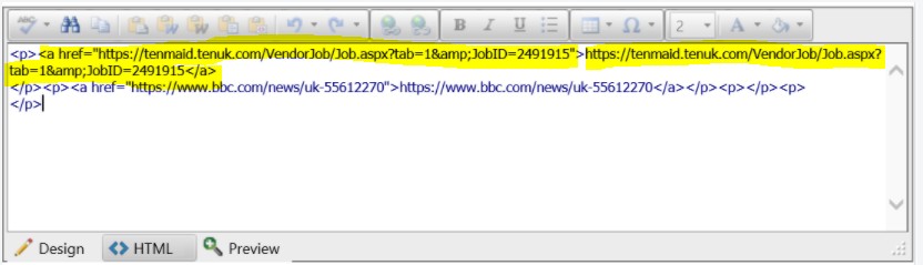 Telerik-> RadEditor - > HTML View on Chrome, <a> tags are not displayed on TenMAID link but <a> tags are shown on external link.