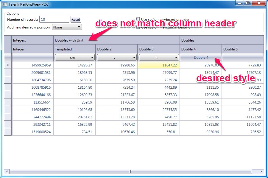 - The group column headers styling does not match the style of the column headers as per selected theme (see attached "column group default header style.jpg"). I was able to hack something by wasting my time finding the style of the column header, and creating a custom style based on CommonColumnHeaderStyle to target CommonColumnHeader, which is obviously a convoluted way of getting this done. Am I missing something? How can I apply the same theme to the group column headers without resorting to hacking? This simply works out of the box with grids of other vendors, like ComponentOne FlexGrid, or DevExpress data grid.