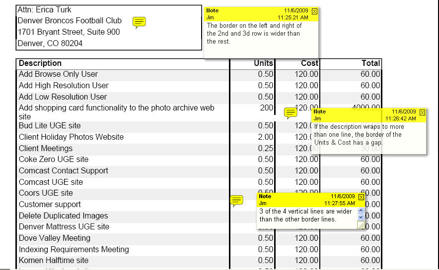I am generating invoices by saving a Telerik Report as a PDF file. I am running into inconsistent behavior with the borders. I have attached an image of the PDF which contains comments that explain the issues I am experiencing. I have also attached the report code.
