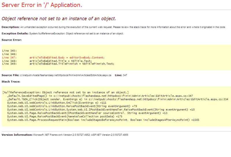Server Error in '/' Application.Object reference not set to an instance of an object.Description: An unhandled exception occurred during the execution of the current web request. Please review the stack trace for more information about the error and where it originated in the code. Exception Details: System.NullReferenceException: Object reference not set to an instance of an object.Source Error: Line 345:Line 346:Line 347: articleToBeEdited.Body = editorSweBody.Content;Line 348: articleToBeEdited.Title = tbTitle.Text;Line 349: articleToBeEdited.TitleFinnish = tbTitleFinnish.Text;Source File: c:\inetpub\vhosts\flashandasp.net\httpdocs\finin\Admin\Articles\EditArticle.aspx.cs Line: 347 Stack Trace: [NullReferenceException: Object reference not set to an instance of an object.] _Default.SaveEditedPage() in c:\inetpub\vhosts\flashandasp.net\httpdocs\finin\Admin\Articles\EditArticle.aspx.cs:347 _Default.lbOk_Click(Object sender, EventArgs e) in c:\inetpub\vhosts\flashandasp.net\httpdocs\finin\Admin\Articles\EditArticle.aspx.cs:334 System.Web.UI.WebControls.LinkButton.OnClick(EventArgs e) +111 System.Web.UI.WebControls.LinkButton.RaisePostBackEvent(String eventArgument) +79 System.Web.UI.WebControls.LinkButton.System.Web.UI.IPostBackEventHandler.RaisePostBackEvent(String eventArgument) +10 System.Web.UI.Page.RaisePostBackEvent(IPostBackEventHandler sourceControl, String eventArgument) +13 System.Web.UI.Page.RaisePostBackEvent(NameValueCollection postData) +175 System.Web.UI.Page.ProcessRequestMain(Boolean includeStagesBeforeAsyncPoint, Boolean includeStagesAfterAsyncPoint) +15650